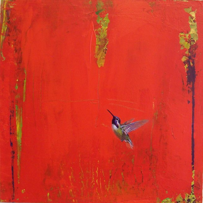 A Pair of Allens Hummingbirds in Red with Movement • 36″ x 36″ • Acrylic on Canvas • 2012